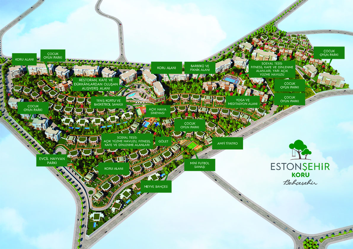 İstanbul’un yatırım değeri günden güne artan bölgesi Bahçeşehir’de, 215 dönüm arazi üzerine kurulu merkezinde doğa sevgisinin filizlendiği yepyeni bir yaşam konseptiyle ve az katlı mimarisiyle Eston Şehir Koru, sakinlerini bekliyor.